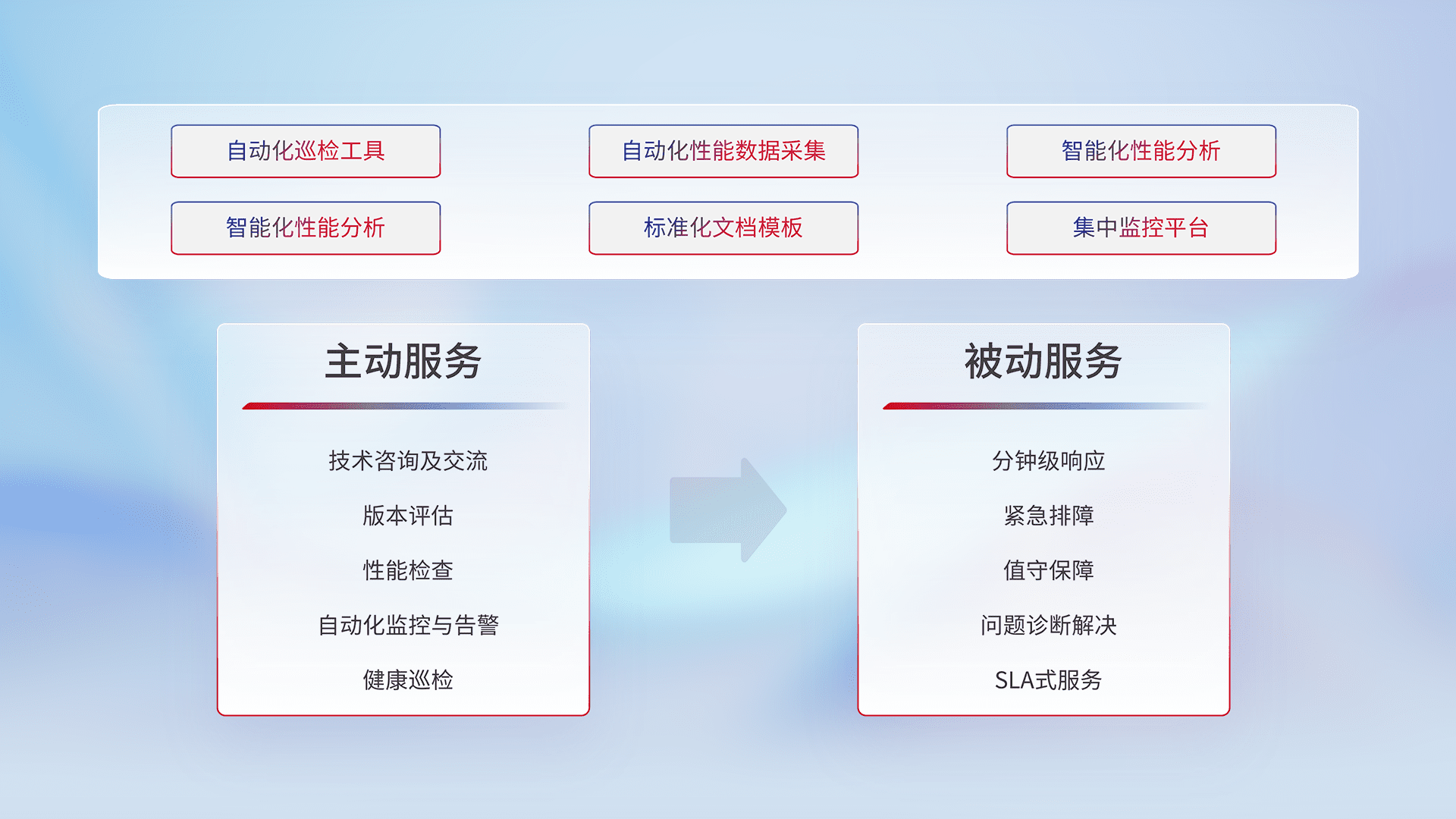 智能化工具和标准化文档,,,保障服务质量,,,提供主动服务(包含技术咨询、、、、版本评估、、、性能检查、、自动化监控与告警、、健康巡检)和被动服务包含(分钟级响应、、、紧急排障、、值守保障、、、、问题诊断解决、、、SLA服务)。。。
