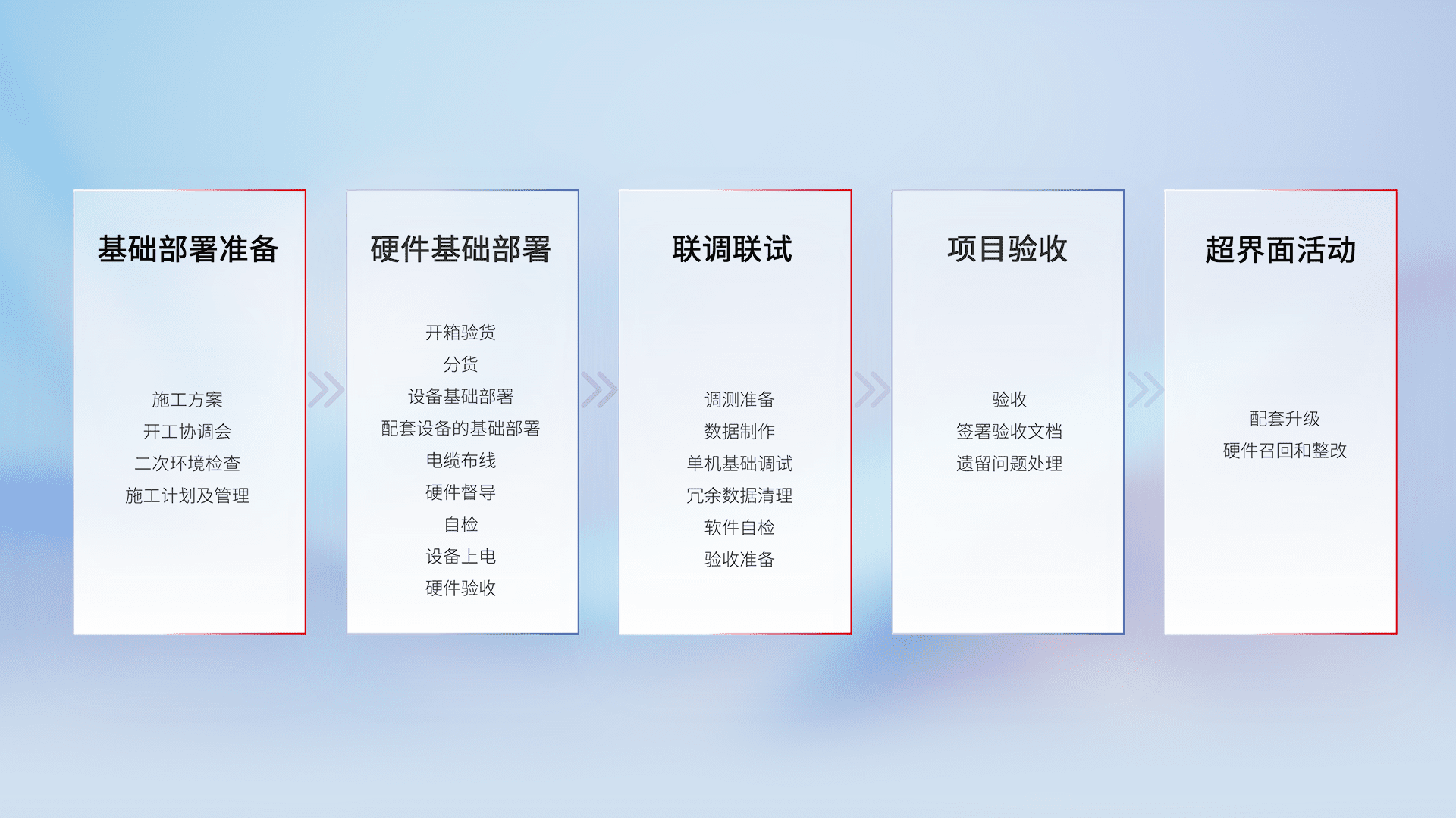 从基础部署准备、、、、硬件基础部署、、、联调联试、、项目验收、、、、越界面活动的全过程可追溯,,,,保证施工质量和进度。。